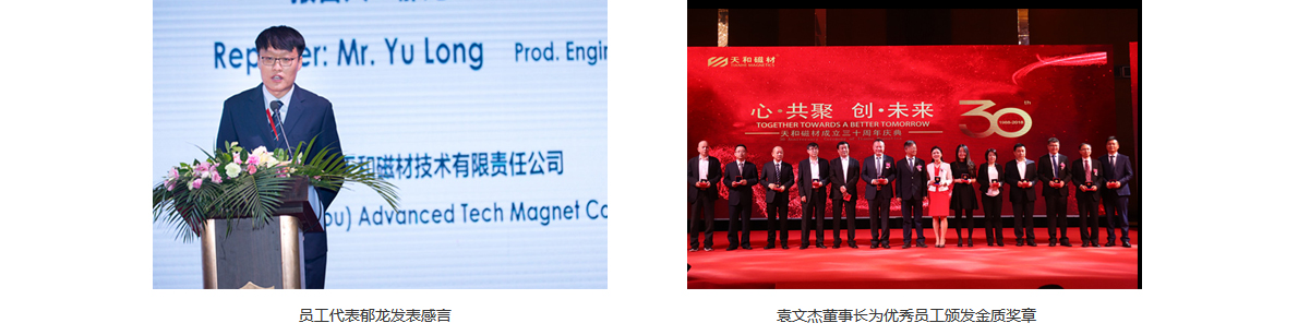 388vip太阳集团磁材发展至今,离不开全体员工的传承与奉献,离不开老员工的长期坚守和新员工的持续加盟。公司生产部工程师郁龙代表全体员工表达了心声:为自己能够在这样一个锐意进取又温馨舒适的大家庭中工作而倍感自豪!公司30年来积淀的企业文化深深地激励着每一个员工,让大家不断地探索与追逐梦想。公司给予了员工平台和机会,大家必将全力以赴,不负信任,让公司“安全、奋斗、创新、诚信、责任”的核心价值观传承下去、发扬光大。同时,为了感谢贡献卓越的优秀员工,袁文杰董事长为他们颁发了代表最高荣誉的金质奖章,以资激励。